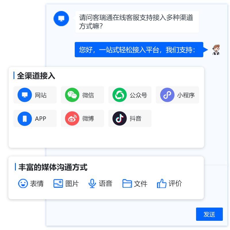 覆盖国内外多渠道,包括:网站、APP、微信小程序、微信公众号、微博、抖音等所有主流营销渠道,一站式轻松接入平台,提升沟通效率,降低公司人力运营成本。