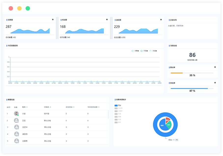 智能客服综合分析页面访问量、访问次数、对话次数、浏览量、IP数等数据实时显示,关键指标一屏尽览。
