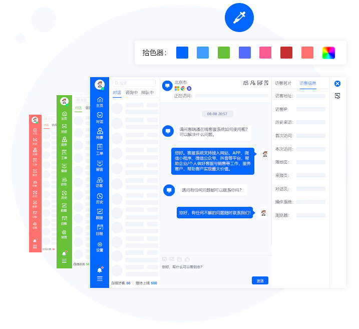 丰富的外观和功能自定义,通过后台外观设置,可修改对话窗口颜色,样式,支持单个和组合模式的风格样式。